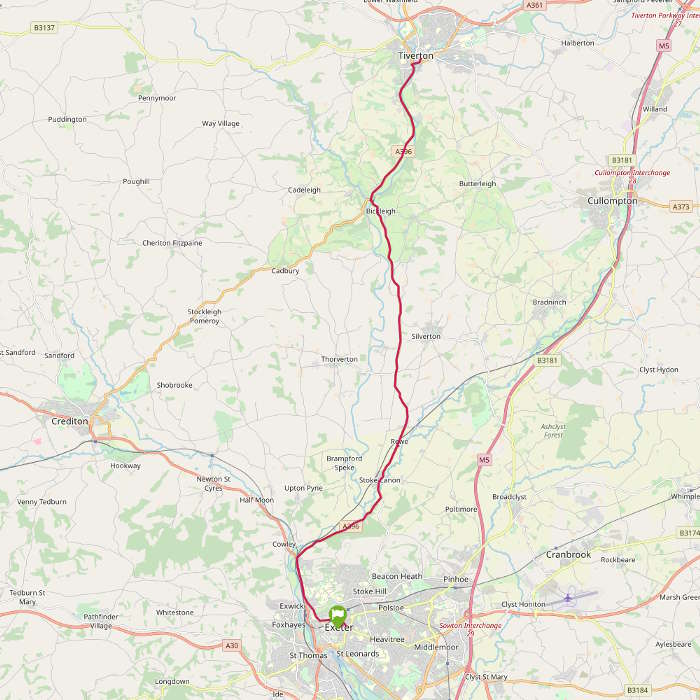 Bus Stops: Tiverton Bus Station (Any) - Bickleigh Bridge (SW-bound) - Silverton, opp Ruffwell Hotel - Rewe Church (SW-bound) - Stoke Canon, opp Post Office opp - Duryard Cowley Bridge (S-bound) - Exeter Bus Station