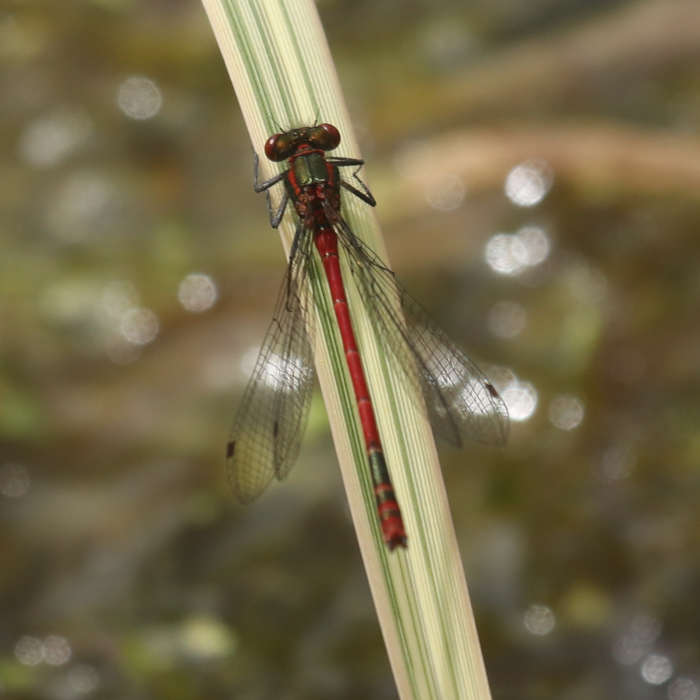 Male Large red damselflies are bright red with a black thorax and black bands towards the end of the body. The amount of red and black on the females' abdomens varies, with some forms appearing almost entirely black. The similar Small red damselfly is a much rarer species that is only found on heathlands in the south of England and West Wales. It is smaller, more delicate and has less red than its larger relative.