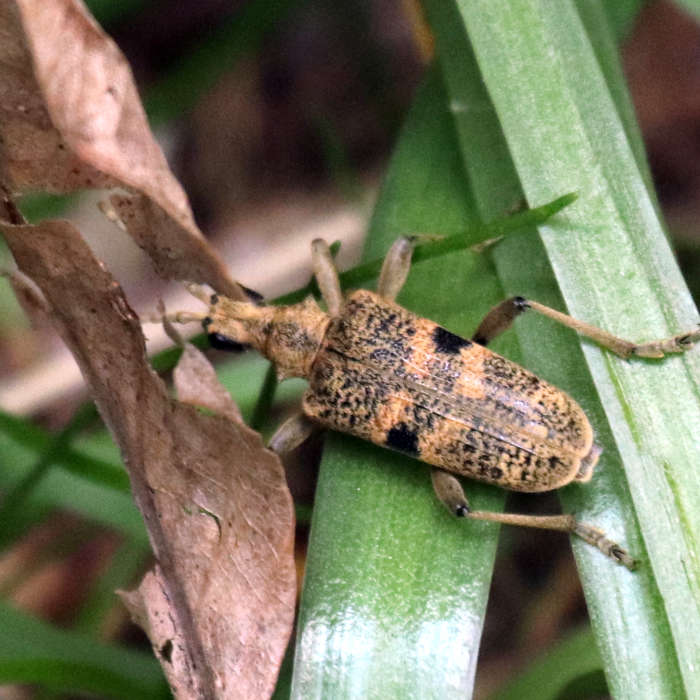A mottled yellowish-brown and black beetle. It has two large black spots on its wing cases, with a pale band either side of each spot. The antennae are relatively short for a longhorn beetle.
